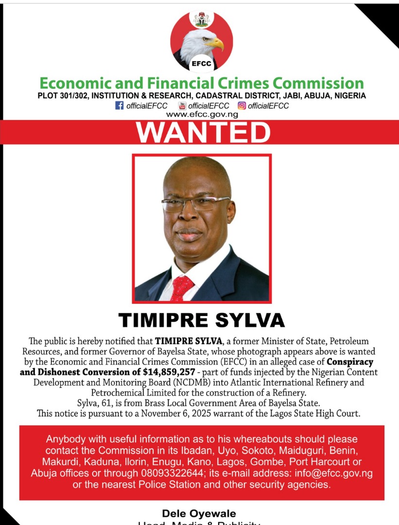 In a statement signed by Dele Oyewale, EFCC spokesperson, the commission said the funds were part of investments by the Nigerian Content Development and Monitoring Board (NCDMB) into Atlantic International Refinery and Petrochemical Limited. The agency urged anyone with information on Sylva’s whereabouts to contact its offices or the nearest police station.